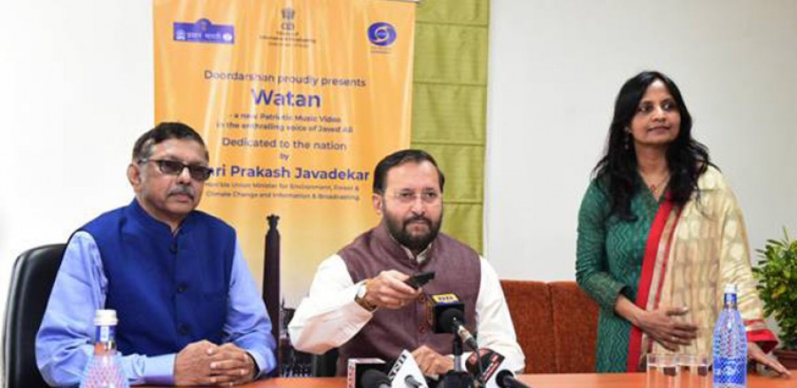 नई दिल्ली। केंद्रीय सूचना एवं प्रसारण मंत्री प्रकाश जावड़ेकर ने आज नई दिल्ली में स्वतंत्रता दिवस 2019 के उपलक्ष्य में दूरदर्शन के निर्मित देशभक्ति गीत 'वतन' को जारी किया और कहा कि नए भारत को समर्पित इस गीत में केंद्र सरकार के कई अग्रणी कार्यक्रमों और पहलों के संबंध में जानकारी दी गई है। उन्होंने कहा कि इसमें हाल ही में चंद्रयान-2 के सफलतापूर्वक प्रक्षेपण के पीछे केंद्र सरकार के दृढ़ संकल्प और दूरदर्शिता एवं गीत में सशस्त्रबलों की वीरता और पराक्रम और शहीदों को श्रद्धांजलि दी गई है। प्रकाश जावड़ेकर ने गीत के सृजन के लिए दूरदर्शन और प्रसार भारती को बधाई दी। उन्होंने कहा कि गीत इस वर्ष के स्वतंत्रता दिवस समारोह में जोश को और ज्यादा बढ़ाएगा और नए रंग भरेगा।