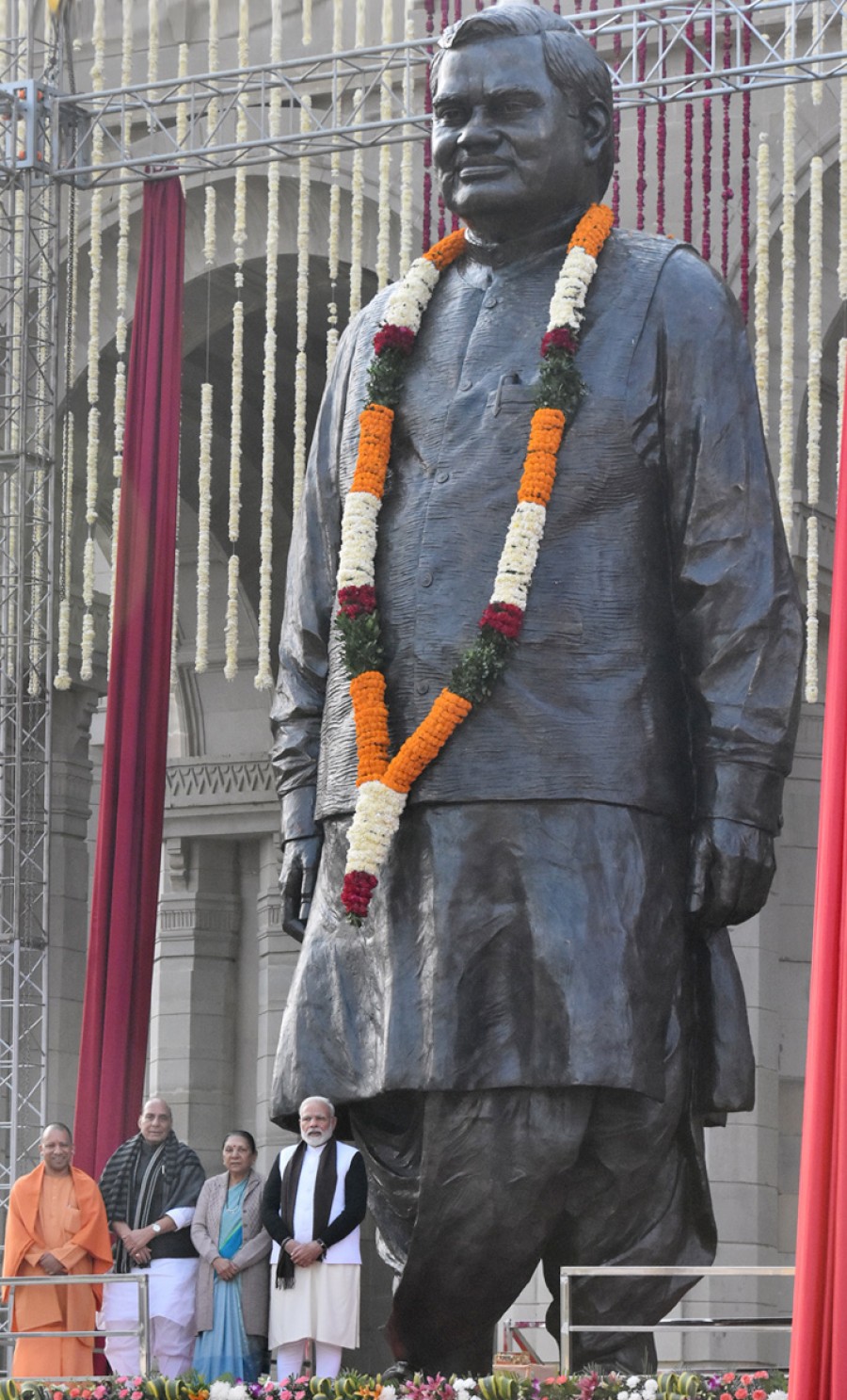 लखनऊ। प्रधानमंत्री नरेंद्र मोदी ने भाजपा के युगपुरुष देश के प्रधानमंत्री रहे और भारतरत्न अटल बिहारी वाजपेयी की जयंती पर आज यहां लोकभवन परिसर में उनकी 25 फीट ऊंची कांस्य प्रतिमा का अनावरण किया। प्रधानमंत्री नरेंद्र मोदी, ग्रहमंत्री राजनाथ सिंह, उत्तर प्रदेश की राज्यपाल आनंदीबेन पटेल, विधानसभा अध्यक्ष हृदयनारायण दीक्षित, मुख्यमंत्री योगी आदित्यनाथ आदि राजनेताओं ने अटल बिहारी वाजपेयी की प्रतिमा पर श्रद्धासुमन भी अर्पित किए। प्रधानमंत्री नरेंद्र मोदी ने अटलजी के जीवन पर भावनात्मक संबोधन दिया। उन्होंने उनकी कई स्मृतियों का उल्लेख किया। प्रधानमंत्री ने अटल बिहारी वाजपेयी की प्रतिमा के शिल्पी राजकुमार पंडित की शानदार प्रतिमा बनाने के लिए उनकी सराहना की। राजकुमार पंडित ने प्रधानमंत्री को भी एक स्मृति चिन्ह भेंट किया। ज्ञातव्य है कि यह प्रतिमा उत्तर प्रदेश सरकार के संस्कृति विभाग ने निर्मित कराई है।