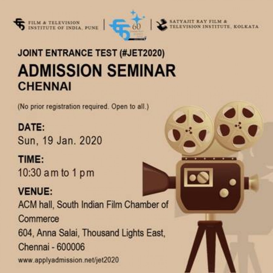 पुणे। सत्यजीत रे फिल्म एंड टेलीविजन इंस्टीट्यूट कोलकाता और फिल्म एंड टेलीविजन इंस्टीट्यूट ऑफ इंडिया पुणे में प्रवेश पाने के इच्छुक उम्मीदवारों को इस वर्ष से बहुस्तरीय चयन प्रक्रिया से गुजरना पड़ेगा। यह दोनों संस्थान फिल्म निर्माण एवं टेलीविजन प्रोडक्शन क्षेत्र के अग्रणी शिक्षण संस्थान माने जाते हैं। चयन प्रक्रिया के पहले चरण के तहत अखिल भारतीय स्तर पर एक लिखित परीक्षा होगी, जिसे संयुक्त प्रवेश परीक्षा (जेईटी 2020) कहा जाता है।