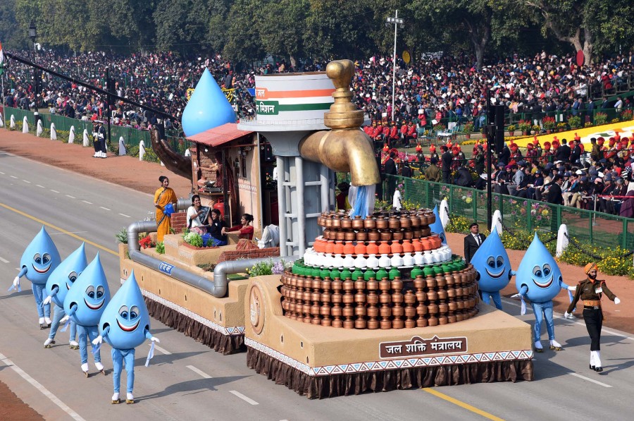 जल शक्ति मंत्रालय की झांकी ‘जल जीवन मिशन’ की परिकल्पना का जीवंत स्वरूप था। सामने का डिजाइन एक विशाल पीतल के नल और एक धात्विक घड़े के रूपमें था, जोकि छोटे-छोटे धात्विक घड़ों से बना हुआ था। यह लाखों ग्रामीण घरों का प्रतिनिधित्व करता है। मध्य भाग में दर्शाया गया था कि नए भारत में कैसे एक ग्रामीण परिवार जेजेएम के तहत लाभ प्राप्त करता करेगा। एक परिवार को बहते हुए जल की सुविधा (रसोई घर, शौचालय, कपड़े, बर्तन धोने के क्षेत्र में), ग्रे-वाटर सोकपिट् में बहता हुआ, इज्जत घर के साथ दर्शाया गया था। एक सामान्य ग्रामीण परिवार को बेहतर जीवनशैली के साथ अपने दैनिक कार्यों को करते हुए दर्शाया गया था, जोकि जल जीवन मिशन से संभव हो सकेगा। झांकी के पिछले भाग में जल संरक्षण को एक ऐसे मॉडल के रूपमें दर्शाया गया था, जो जल की एक विशाल बूंद को एकत्रित करते हुए दो हथेलियों की भांति प्रतीत हो रहा था, जो वर्षा जल संचयन तथा जल संरक्षण के लिए किए गए सामूहिक प्रयासों को दर्शाता है। जेजेएम को एक जन आंदोलन बनाने के प्रतीक स्वरूप विभिन्न राज्यों और केंद्रशासित प्रदेशों के नीले रंग के जल बूंद वाले सांस्कृतिक परिधानों से सुसज्जित कलाकारों को साथ चलते हुए दर्शाया गया था।
