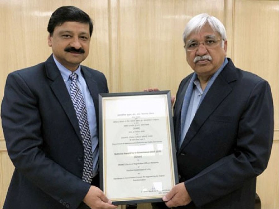 नई दिल्ली। भारत सरकार के प्रशासनिक सुधार और लोक शिकायत विभाग ने वर्ष 2019-20 के संबंध में डिजिटल परिवर्तन की सरकारी प्रक्रिया में उत्कृष्टता के लिए भारत निर्वाचन आयोग को ‘सिल्वर’ पुरस्कार प्रदान किया। यह पुरस्कार उन परियोजनाओं के लिए दिया जाता है, जिनमें कार्य प्रणाली का मूल्यांकन और उनकी पुनर्रचना शामिल होती है तथा जिनके तहत कुशलता, प्रक्रिया, गुणवत्ता और सेवा क्षेत्र में सुधार किया जाता है। यह पुरस्कार 7-8 फरवरी 2020 को मुंबई में ई-प्रशासन पर 23वें राष्ट्रीय सम्मेलन के दौरान दिया गया। सम्मेलन का आयोजन प्रशासनिक सुधार और लोक शिकायत विभाग ने किया था। वरिष्ठ उप निर्वाचन आयुक्त डॉ संदीप सक्सेना और भारत निर्वाचन आयोग संबंधी एरोनेट परियोजना प्रमुख तथा आईसीटी एवं सीआईएसओ निदेशक डॉ कुशाल पाठक ने यह पुरस्कार मुख्य चुनाव आयुक्त सुनील अरोड़ा को प्रदान किया।