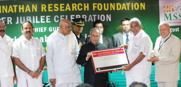 राष्ट्रपति ने भारत की हरित क्रांति और खाद्य के क्षेत्र में आत्मनिर्भरता के लिए प्रोफेसर एमएस स्वामीनाथन के योगदान की चर्चा की। उन्होंने कहा कि स्वामीनाथन के उत्कृष्ट कार्यों के लिए राष्ट्र उन्हें हमेशा याद रखेगा। राष्ट्रपति ने केरल के मुख्यमंत्री ओमेन चांडी को वैश्विक तौर पर महत्वपूर्ण कृषि विरासत प्रणाली के रूप में एफएओ के द्वारा कुट्टानाड में समुद्र तल से नीचे वाली कृषि प्रणाली की मान्यता देते हुए एक प्रतीकचिन्ह भेंट किया।