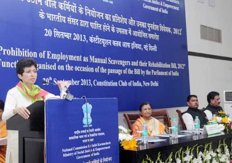 नई दिल्ली। केंद्रीय सामाजिक न्याय एवं अधिकारिता मंत्री कुमारी सैलजा ने कहा है कि मैला ढोने की प्रथा को रोज़गार के रुप में रोकने तथा सफाई कर्मियों के पुनर्वास विधेयक-2012 के पारित होने से देश में मैला ढोने की अमानवीय प्रथा पूरी तरह समाप्त हो जाएगी। एक समारोह में भाग लेते हुए कुमारी सैलजा ने कहा कि यह हम सभी पर निर्भर है कि विधेयक को उसकी भावना के अनुरुप ही लागू किया जाए। संसद में मैला ढोने वाले और उनके पुनर्वास संबंधी विधेयक-2012 के पारित होने के अवसर पर सफाई कर्मचारियों के राष्ट्रीय आयोग ने इस समारोह का आयोजन किया था। देश के विभिन्न भागों से, राज्य सफाई कर्मचारी आयोगों के सदस्यों और अध्यक्षों, राष्ट्रीय और राज्य स्तर के संघों तथा अन्य सिविल सोसाइटी संगठनों के प्रतिनिधियों ने समारोह में भाग लिया।