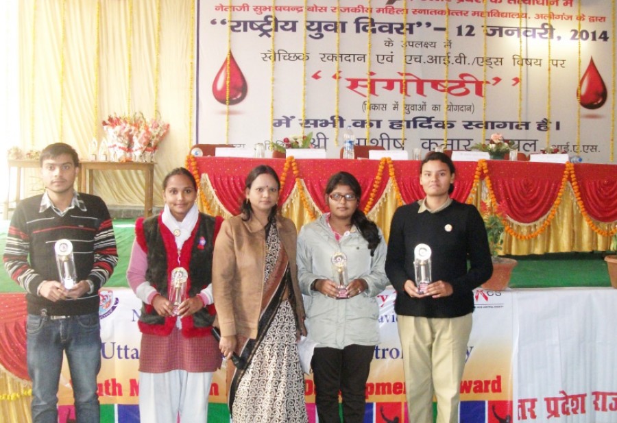 लखनऊ। नेताजी सुभाष चंद्र बोस राजकीय महिला स्नातकोत्तर महाविद्यालय अलीगंज लखनऊ में राष्ट्रीय सेवा योजना शिविर में युवाओं के प्रेरणास्रोत स्वामी विवेकानंद के जन्मदिन पर आयोजित ‘राष्ट्रीय युवा दिवस’ पर स्वेच्छा से रक्तदान करने वाले छात्र-छात्राओं को स्मृति चिन्ह प्रदान किए गए। राज्य रक्त संरक्षण परिषद उत्तर प्रदेश एवं नेताजी सुभाष चंद्र बोस राजकीय महिला स्नातकोत्तर महाविद्यालय के संयुक्त तत्वावधान में कल एनएसएस शिविर में पांचवे दिन 'युवा रक्तदाता आशा की किरण' नाम से एचआईवी-एड्स विषय पर एक संगोष्ठी और स्वैच्छिक रक्तदान कार्यक्रम का आयोजन किया गया था। इसमें उत्तर प्रदेश राज्य एड्स नियंत्रण सोसाइटी के परियोजना निदेशक आशीष कुमार गोयल सहित छात्र-छात्राओं और अन्य रक्तदाताओं ने बढ़-चढ़कर हिस्सा लिया। जिन छात्र-छात्राओं ने रक्तदान में पंजीकरण कराया था, उनमें से केवल 12 लोगों ने रक्तदान किया। बहुत से छात्र-छात्राओं को रक्तदान के मानकों के योग्य नहीं पाया गया। केजीएमयू लखनऊ की रक्तदान विभाग की अध्यक्ष डॉ तुलिका चंद्रा ने रक्तदान कार्यक्रम का समन्वय किया। महाविद्यालय की प्राचार्य डॉ प्रेमा पांडेय, राष्ट्रीय सेवा योजना शिविर की दोनों इकाईयों की कार्यक्रम अधिकारी डॉ शिवानी श्रीवास्तव एवं डॉ क्रांति सिंह ने आभार व्यक्त किया।