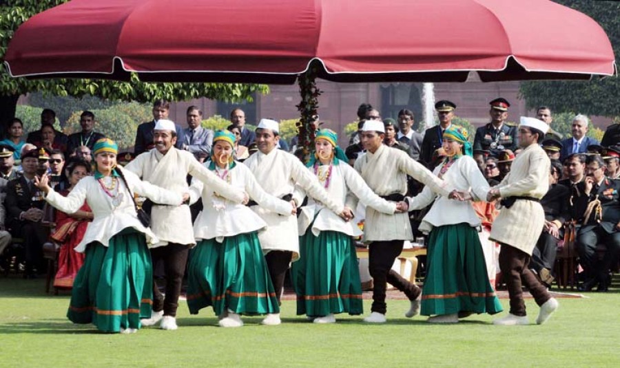 नई दिल्ली। गणतंत्र दिवस समारोह के अवसर पर राष्ट्रपति भवन में आयोजित रंगा-रंग कार्यक्रम में उत्तराखंड के कलाकारों ने राष्ट्रपति प्रणब मुखर्जी के सम्मुख तांदी नृत्य प्रस्तुत किया, जिसकी राष्ट्रपति ने भूरी-भूरी प्रशंसा की। राष्ट्रीय रंगशाला शिविर नई दिल्ली में संपूर्ण देश से आये कलाकारों में से राष्ट्रपति भवन में सांस्कृतिक प्रस्तुति हेतु केवल चार प्रदेशों उत्तराखंड, पश्चिम बंगाल, महाराष्ट्र, तमिलनाडू के टीमों का चयन किया गया था। उत्तराखंड राज्य के टीम लीडर केएस चौहान के नेतृत्व में उत्तराखंड के कलाकारों ने राष्ट्रपति के सम्मुख पांरपरिक वेष-भूषा में तांदी नृत्य प्रस्तुत किया। राष्ट्रपति ने तांदी नृत्य के संबंध में टीम लीडर केएस चौहान से जानकारी प्राप्त की तथा उत्तराखंड के कलाकारों की सांस्कृतिक प्रस्तुति एवं पारंपरिक वेष-भूषा की सराहना की। राष्ट्रपति से प्रशंसा पाकर उत्तराखंड के कलाकार बहुत अधिक प्रफुल्लित हुए।