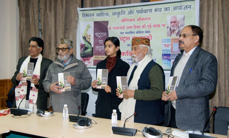 शिमला। हिमाचल प्रदेश के जानेमाने वरिष्ठ कवि व आलोचक श्रीनिवासश्रीकांत के 75वें जन्मदिन की पूर्व संन्ध्या पर शिमला के गेयटी सभागार में उनका लेखकों ने सार्वजनिक अभिनंदन किया। इस मौके पर हिमालय साहित्य, संस्कृति और पर्यावरण मंच के तत्वावधान एक गोष्ठी का आयोजन किया गया, जिसमें प्रदेश के लगभग 60 साहित्यकारों ने भाग लिया। इस अवसर पर श्रीनिवास श्रीकांत के सद्य प्रकाशित कविता संग्रह चट्टान पर लड़की का विमोचन हुआ और विमोचन भी एक बाल कलाकार सिमरन ने किया। यह पहला अवसर था जब किसी संस्था की ओर से परंपरा को तोड़ते हुए किसी बालिका के कर कमलों से वरिष्ठ साहित्यकार की पुस्तक का लोकार्पण किया गया।