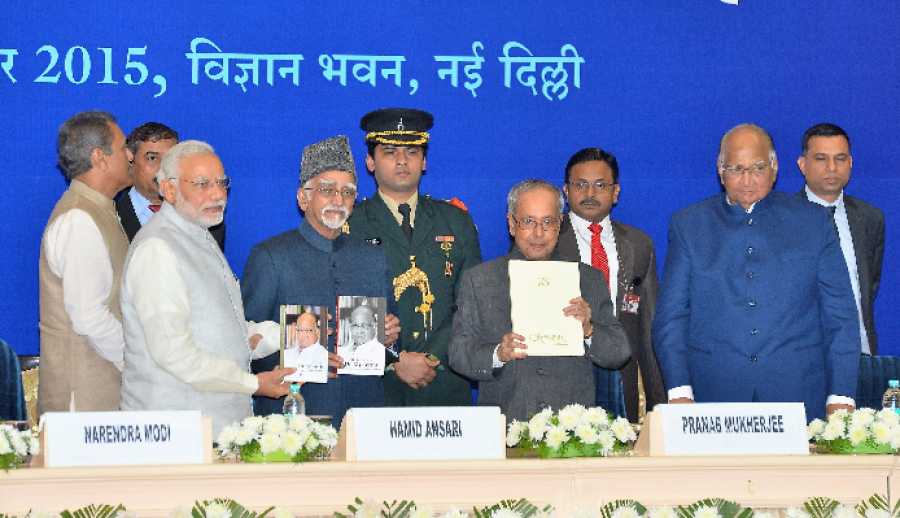 नई दिल्ली। प्रधानमंत्री नरेंद्र मोदी नई दिल्ली के विज्ञान भवन में पूर्व केंद्रीय मंत्री और महाराष्ट्र के मुख्यमंत्री रहे और एनसीपी अध्यक्ष शरद पवार के 75वें जन्मदिवस समारोह में शामिल हुए। प्रधानमंत्री ने शरद पवार के राजनीतिक जीवन को रचनात्मक बताया। उन्होंने कृषि के प्रति शरद पवार के आधुनिक और वैज्ञानिक दृष्टिकोण और भारत में कृषि क्षेत्र में उनके योगदान की सराहना की। प्रधानमंत्री ने शरद पवार की ऑन माई टर्म्स पुस्तक का विमोचन भी किया। इस अवसर पर राष्ट्रपति प्रणब मुखर्जी और उपराष्ट्रपति मोहम्मद हामिद अंसारी भी उपस्थित थे।