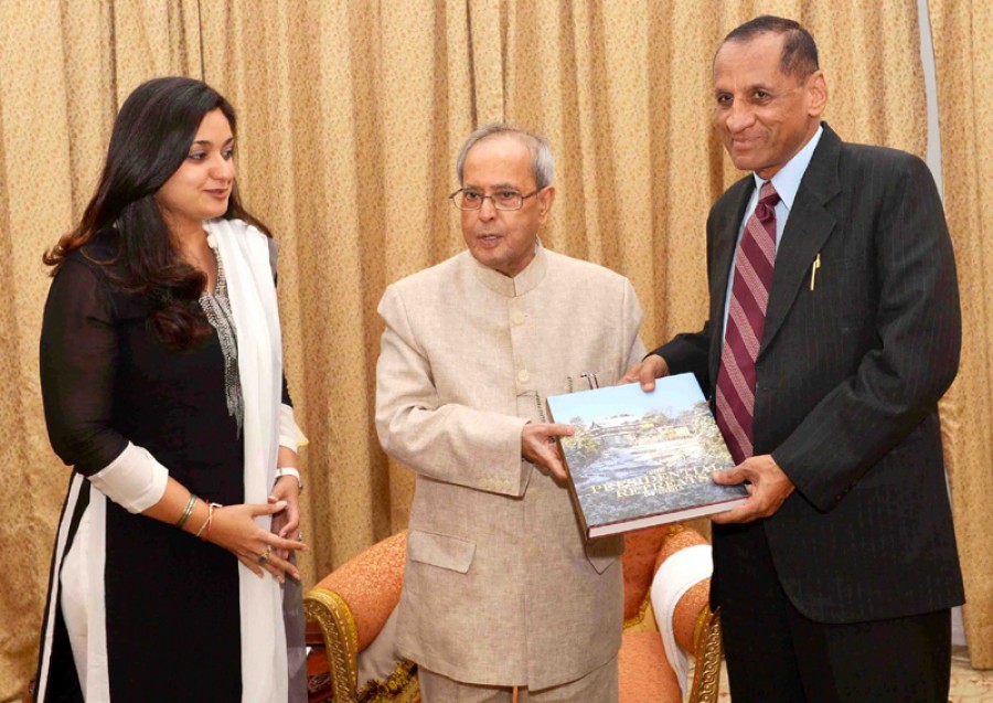 नई दिल्ली। राष्ट्रपति प्रणब मुखर्जी ने सिकंदराबाद में राष्ट्रपति निलयम में तेलंगाना के राज्यपाल ईएसएल नरसिम्हन को सिकंदराबाद के राष्ट्रपति निलयम पर पुस्तक की प्रति भेंट की। हैदराबाद की संरक्षण वास्तुकार अनुराधा नाइक, जिन्होंने इस पुस्तक के बोलारम और राष्ट्रपति निलयम पर अध्याय लिखे हैं, भी इस अवसर पर उपस्थित थीं। 'द प्रेसीडेंसियल रिट्रीट्स ऑफ इंडिया' राष्ट्रपति सचिवालय के आयोग के अंतर्गत सहपीडिया और इंदिरा गांधी राष्ट्रीय कला केंद्र ने तैयार की है। सूचना और प्रसारण मंत्रालय के प्रकाशन विभाग से प्रकाशित इस पुस्तक में मशोबरा में 'द रिट्रीट' और सिकंदराबाद में 'राष्ट्रपति निलयम' को शामिल किया गया है और यह जल्दी ही लोगों के लिए उपलब्ध होगी।