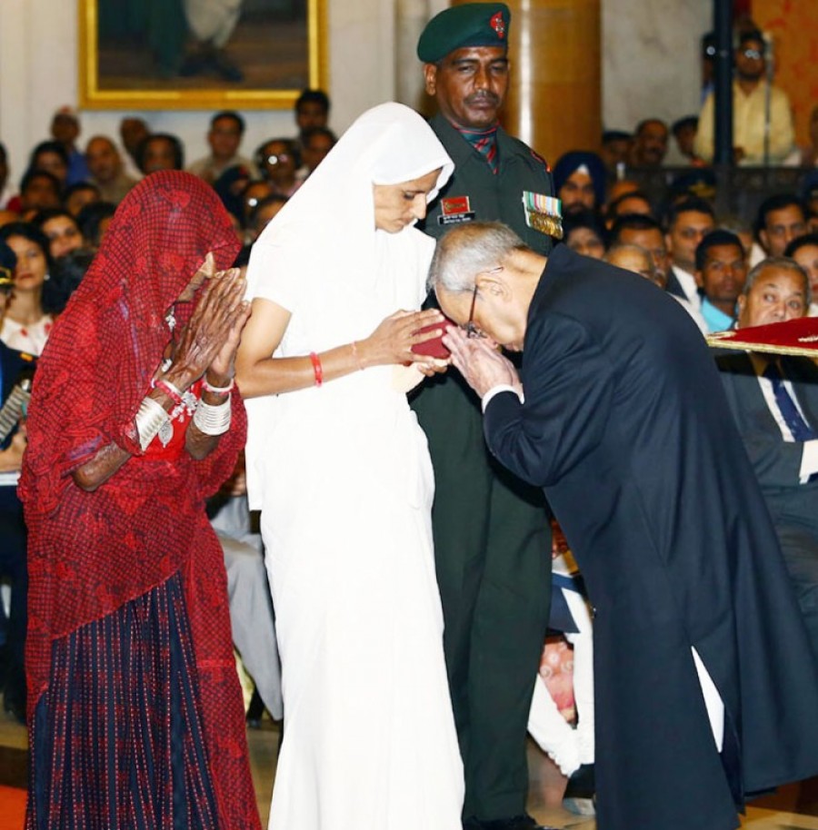 राष्ट्रीय राइफल्स की प्रथम बटालियन माहर रेजीमेंट के सिपाही धर्मराम की पत्नी टीमू देवी और धर्मराम की माता अमरु देवी ने शौर्य चक्र प्राप्त किया। पिछले अलंकरण समारोह के मरणोपरांत पुरस्कार प्राप्तकर्ता के परिजन को भी राष्ट्रपति प्रणब मुखर्जी ने पुरस्कार प्रदान किया। मरणोपरांत पुरस्कार प्राप्तकर्ताओं के माता-पिता को सम्मानित करने की इस सकारात्मक पहल की सभी ने सराहना की। समारोह के दौरान तीनों सेनाओं के अधिकारियों को गणतंत्र दिवस-2016 को घोषित किए गए पुरस्कार प्रदान किए गए, जिनमें कुल 42 विशिष्ट सेवा पुरस्कारों के अंतर्गत 13 परम विशिष्ट सेवा पदक, 2 उत्तम युद्ध सेवा पदक, 2 अति विशिष्ट सेवा पदक और 25 अति विशिष्ट सेवा पदक शामिल हैं।