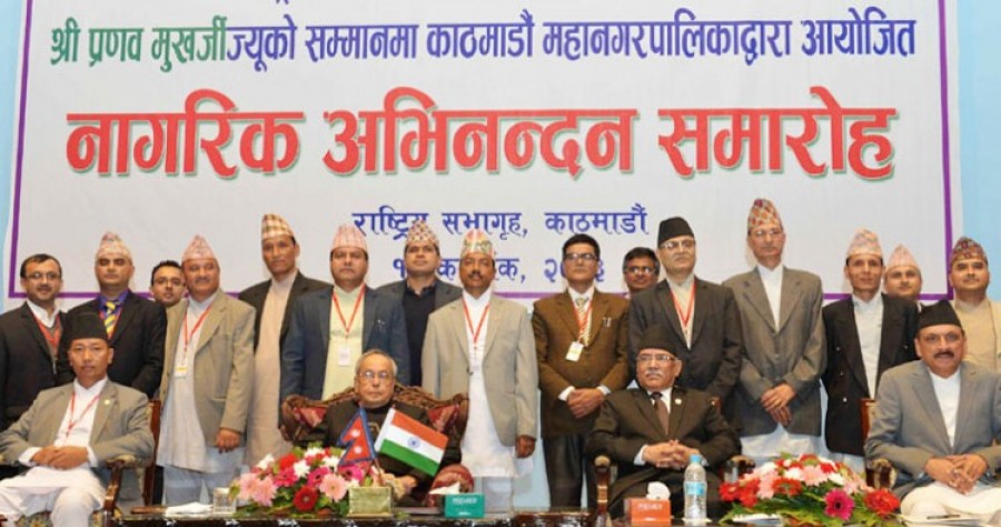 काठमांडू। राष्ट्रपति प्रणब मुखर्जी का नेपाल की राजधानी काठमांडू में काठमांडू म्यूनिसिपल सिटी की ओर से नागरिक अभिनंदन किया गया। राष्ट्रपति ने इस अवसर पर कहा कि काठमांडू केवल नेपाल की राजनीतिक राजधानी ही नहीं, बल्कि हमारे क्षेत्र के लोगों के लिए आध्यात्मिक केंद्र भी है। उन्होंने कहा कि मेरी नेपाल यात्रा एक प्रकार की तीर्थयात्रा है। उन्होंने कहा कि भारत और नेपाल के बीच समझदारी और सहयोग को प्रोत्साहित करना एक मिशन है, विश्व में भारत और नेपाल की तरह कोई दो ऐसे देश नहीं जिनकी संस्कृति साझा रही और सीमाएं खुली हैं, भारत सरकार और भारत की जनता इस संबंध को प्रगाढ़ बनाने के लिए संकल्पबद्ध है। राष्ट्रपति ने कहा कि भारत अपने स्वतंत्रता संघर्ष के दौरान नेपाल के नेताओं और नेपाल की जनता से प्राप्त समर्थन को हृदय से याद करता है। उन्होंने कहा कि भारत, नेपाल के संविधान को लागू करने के महत्वपूर्ण कार्य में नेपाल की जनता और नेपाल की सरकार की सफलता की कामना करता है।