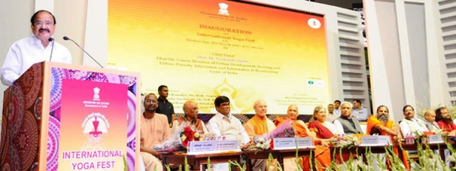 नई दिल्ली। केंद्रीय सूचना प्रसारण तथा शहरी विकास एवं आवास मंत्री एम वेंकैया नायडू ने नई दिल्ली के तालकटोरा स्टेडियम में तीन दिन के अंतर्राष्ट्रीय योग उत्सव का उद्घाटन किया। उत्सव का आयोजन अंतर्राष्ट्रीय योग दिवस 2017 की पूर्व प्रस्तुति के रूप में किया गया है। वेंकैया नायडू ने इस मौके पर कहा कि लोगों में सौहार्द और एकता लाने के लिए योग एकमात्र रास्ता है। उन्होंने कहा कि योग स्वस्थ और तंदुरुस्त रहने में महत्वपूर्ण भूमिका निभाता है। उन्होंने कहा कि प्रधानमंत्री चाहते हैं कि योग को जन आंदोलन बनाया जाए, उन्होंने इसे दुनिया के 192 देशों तक योग को फैलाया है। सूचना और प्रसारण मंत्री ने योग को जन आंदोलन बनाने के काम में योगदान कर रहे योग गुरूओं तथा योग मास्टरों को भी धन्यवाद दिया।