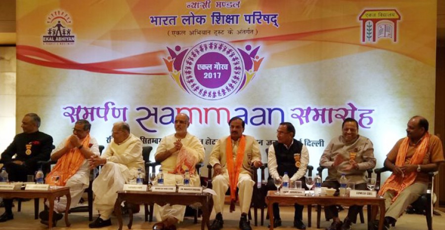 नई दिल्ली। प्रधानमंत्री नरेंद्र मोदी के जन्मदिवस पर देश में भारत लोक शिक्षा परिषद् के 55000 एकल विद्यालयों को वित्तीय संसाधन प्रदान करने वाले देश के उद्योगपति, कंपनीधारकों एवं समाजसेवकों को एक समर्पण सम्मान समारोह में प्रसिद्ध कथावाचक रमेशभाई ओझा और केंद्रीय राज्यमंत्री महेश शर्मा ने सम्मानित किया। इस अवसर पर रमेशभाई ओझा ने कहा कि ईश्वर ने हमें जो संसाधन दिए हैं, उनसे उपार्जित पुण्य धन को ईश्वर के कार्यों के निमित्त बांटकर अपने सामाजिक कर्तव्य का पालन करना चाहिए। दिल्ली के होटल ली-मेरिडियन में आयोजित इस कार्यक्रम में रमेशभाई ओझा, रामेश्वरलाल काबरा उद्योगपति, डॉ मधुकर गुप्ता अतिरिक्त सचिव उद्योग मंत्रालय एवं मांगेराम अग्रवाल की उपस्थिति में अनेक भामाशाहों महाशताकवीरों और शाताकवीरों को सम्मानित किया गया।