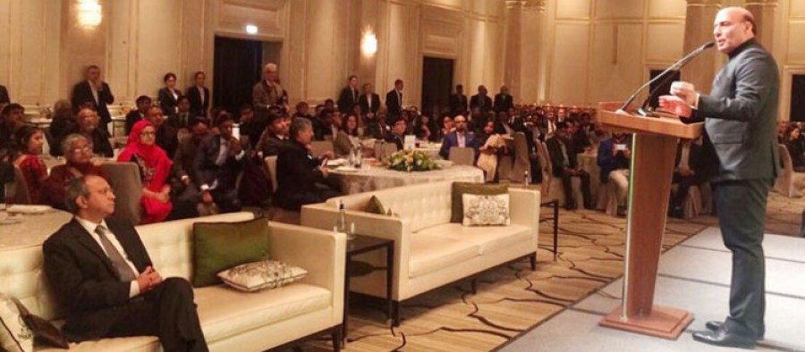 केंद्रीय गृहमंत्री राजनाथ सिंह ने रूस में रह रहे प्रत्येक भारतीय के कार्यों की प्रशंसा की और उन्हें भारत के ‘सांस्कृतिक दूत’ की संज्ञा दी। उन्होंने कहा कि उनकी और भारत के बीच भौतिक दूरी लंबी हो सकती, किंतु भावनात्मक दूरी कभी भी नहीं हो सकती। गृहमंत्री ने इस अवसर पर भारत सरकार के आतंकवाद और आतंकवादियों की घुसपैठ को रोकने के प्रयासों और सैन्यबलों के दृढ़ संकल्प तथा संयम के बारे में जानकारी दी। उन्होंने आतंकवाद को विश्व द्वारा झेला जा रहा सबसे बड़ा खतरा बताया। उन्होंने देश के विकास के लिए विभिन्न क्षेत्रों में जनधन योजना, मेक इन इंडिया जैसे भारत सरकार के प्रयासों के बारे में भी जानकारी दी। उन्होंने कहा कि आधार का उपयोग करके देश को आर्थिक प्रगति पर लाने का कार्य किया जा रहा है।