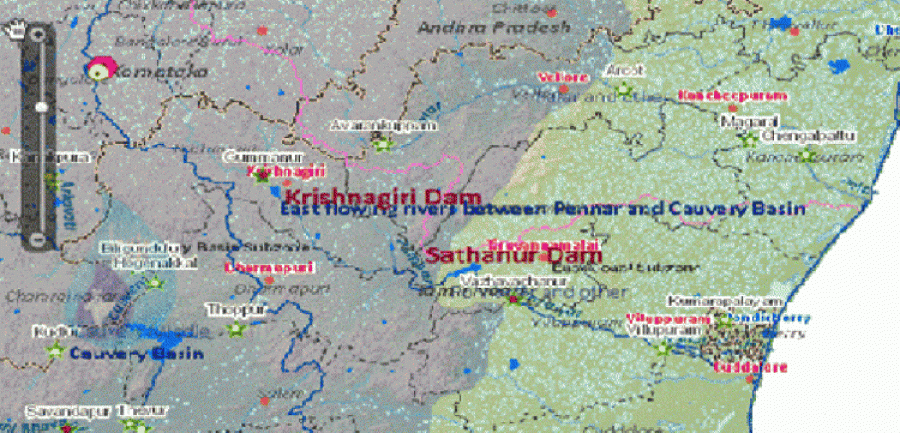कृष्णागिरी जलाशय का निर्माण तमिलनाडु के कृष्णागिरी जिले के कृष्णागिरी नगर से लगभग 10 किलोमीटर दूर पेरियामूथूर गांव के पास पोन्नाइयार नदी पर किया गया था। यह 12O 28’ उत्तरी अक्षांश तथा 78O 11’ पूर्वी देशांतर पर स्थित है। गौरतलब है कि केआरपी बांध का निर्माण मार्च 1955 में शुरू हुआ और नवंबर 1957 में पूर्ण कर सिंचाई के लिए खोल दिया गया था। जलाशय की संग्रहण क्षमता 47.156 एमसीएम है। सथानुर बांध का निर्माण तमिलनाडु के तिरुवन्नामलई जिले में तिरुवन्नामलई नगर के पास वर्ष 1957 के दौरान पूरा किया गया था। यह 12O 12’ उत्तर और 78O 35’ 30” पूर्व में स्थित है। इसकी सकल संग्रहण क्षमता 228.91 एमसीएम है। केंद्रीय जल आयोग ने सथानुर बांध पर पानी की आमद का पूर्वानुमान 2017 से उत्तरपूर्वी मानसून सत्र के बाद शुरू किया है। कृष्णागिरी बांध और सथानुर बांध के बीच पड़ने वाला जलग्रह क्षेत्र 2,000 वर्ग किलोमीटर है। दोनों बांधों के बीच की दूरी 117 किलोमीटर है।