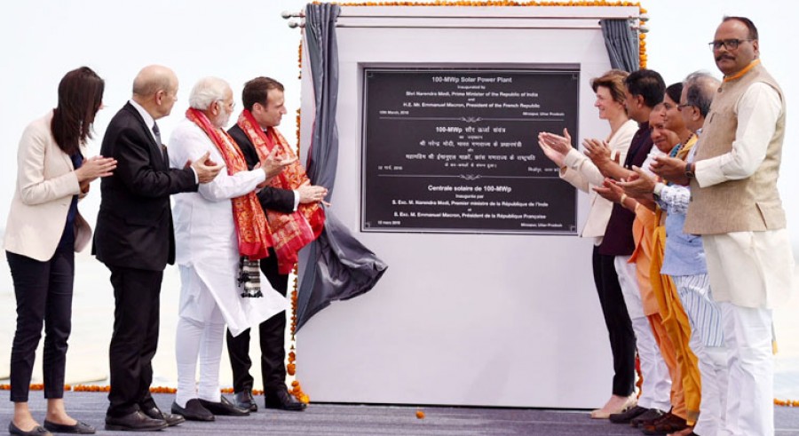लखनऊ/ वाराणसी। फ्रांस के राष्ट्रपति इमैनुएल मैक्रों एवं भारत के प्रधानमंत्री नरेंद्र मोदी ने जनपद मिर्जापुर की दादरकला ग्राम सभा में प्रदेश के सबसे बडे़ सोलर प्लांट का लोकार्पण किया। फ्रांस के राष्ट्रपति इमैनुएल मैक्रों और प्रधानमंत्री नरेंद्र मोदी ने लोकार्पण के बाद सोलर पावर प्लांट का निरीक्षण किया। यूपीनेडा द्वारा चिन्हित भू-भाग लगभग 155 हेक्टेअर पर फ्रांस की एनजी कम्पनी निर्मित सोलर प्लांट में 318,120 पीवी पैनल्स लगाए गए हैं। यह सोलर प्लांट प्रतिवर्ष 157 मिलियन यूनिट बिजली का उत्पादन करेगा। इस अवसर पर मुख्यमंत्री योगी आदित्यनाथ, केंद्रीय स्वास्थ्य एवं परिवार कल्याण राज्यमंत्री अनुप्रिया पटेल, प्रदेश के वित्तमंत्री राजेश अग्रवाल, अतिरिक्त ऊर्जा स्रोत मंत्री बृजेश पाठक, जनप्रतिनिधि व वरिष्ठ अधिकारी उपस्थित थे।