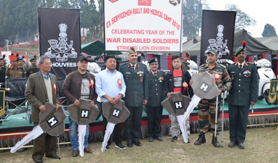 दार्जिलिंग। भारतीय सेना वर्ष 2018 को सेना में 'ड्यूटी के दौरान दिव्यांग सैनिकों के वर्ष' के रूपमें मना रही है, इसीके तहत राष्ट्र निर्माण में सैनिकों की निःस्वार्थ सेवा और बलिदान को याद करने के लिए 25 मार्च को दार्जिलिंग और उदयपुर सैन्य केंद्रों पर भूतपूर्व सैनिकों की एक सशक्तिकरण रैली का आयोजन किया गया। स्ट्राइकिंग लॉयन डिवीजन के मेजर जनरल एमके सागोच ने रैली का उद्घाटन किया, जिसमें युद्ध में दिव्यांग हुए सैनिकों को मोडिफाइड स्कूटर, व्हील चेयर और अन्य संबधित उपकरणों का वितरण कर उन्हें सम्मानित किया गया। इस दौरान युद्ध में भाग लेने वाले पूर्व सैनिकों और वीर नारियों तथा दिव्यांग सैनिकों के बच्चों के लिए शिक्षा अनुदान भी प्रदान किए गए।