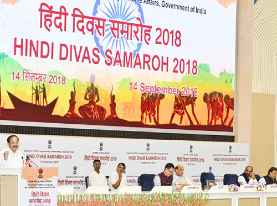 नई दिल्ली। केंद्रीय गृह मंत्रालय के राजभाषा विभाग की ओर से विज्ञान भवन दिल्ली में हिंदी दिवस समारोह का आयोजन किया गया, जिसमें उपराष्ट्रपति वेंकैया नायडु ने विभिन्न मंत्रालयों, विभागों और कार्यालयों के प्रमुखों को राजभाषा कार्यांवयन में उत्कृष्टकार्य हेतु पुरस्कृत भी किया। उपराष्ट्रपति वेंकैया नायडु ने इस अवसर पर कहा कि मातृभाषा आंख होती है, जबकि पराई भाषा चश्मा, यदि आंख ही नहीं होगी तो चश्मे का क्या महत्व रह जाता है। वेंकैया नायडु ने जीवन में पांच चीजों की महत्ता बताते हुए कहा कि हमें मां, जन्मभूमि, मातृभाषा, मातृदेश और गुरू का हमेशा ध्यान रखना चाहिए एवं आवश्यकता पड़ने पर इन पांचों की सेवा के लिए तत्पर होना चाहिए। उपराष्ट्रपति ने कहा कि मातृभाषा में प्राथमिक शिक्षा अनिवार्य होनी चाहिए, ताकि उच्चशिक्षा अपनी भाषा में मिलने में आसानी हो सके। उनका कहना था कि हिंदी के बिना हिंदुस्तान में आगे बढ़ना संभव नहीं है, लेकिन हिंदी ज्ञान परस्पर सहभागिता से संभव किया जाना चाहिए।