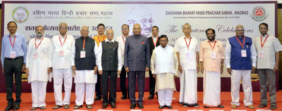 राष्ट्रपति रामनाथ कोविंद ने कहा कि राष्ट्रपिता महात्मा गांधी की प्रेरणा और मार्गदर्शन में इस संस्था को वर्ष 2018 में हिंदी की सेवा के 100 वर्ष पूरा करने के लिए मैं दक्षिण भारत हिंदी प्रचार सभा से जुड़े सभी लोगों को हार्दिक बधाई देता हूं। उन्होंने कहा कि महात्मा गांधी के बाद भारत के प्रथम राष्ट्रपति और भारतरत्न डॉ राजेंद्र प्रसाद ने दक्षिण भारत हिंदी प्रचार सभा के अध्यक्ष का पद संभाला था। रामनाथ कोविंद ने कहा कि स्वाधीनता संग्राम के दौरान स्वदेशी के साथ-साथ स्वभाषा पर भी बहुत ज़ोर दिया गया था, सुब्रह्मण्य भारती की देश प्रेम से भरी तमिल कविताओं की भावना पूरे देश में महसूस की जाती थी। उन्होंने कहा कि भारतीय भाषाओं की जमीन और भावभूमि एक है, इसी एकता को मजबूत बनाने का काम हिंदी समेत सभी भारतीय भाषाओं को करना है। उन्होंने कहा कि चेन्नई में दक्षिण भारत हिंदी प्रचार सभा के परिसर के जिस भवन में गांधीजी ने सन् 1946 में प्रवास किया था, उसे नवंबर 2014 में ‘गांधी हेरिटेज साइट’ घोषित किया गया, उसके बाद उस भवन का पुनर्निर्माण करके पिछले वर्ष गांधी जयंती के दिन दर्शनार्थियों के लिए खोल दिया गया।