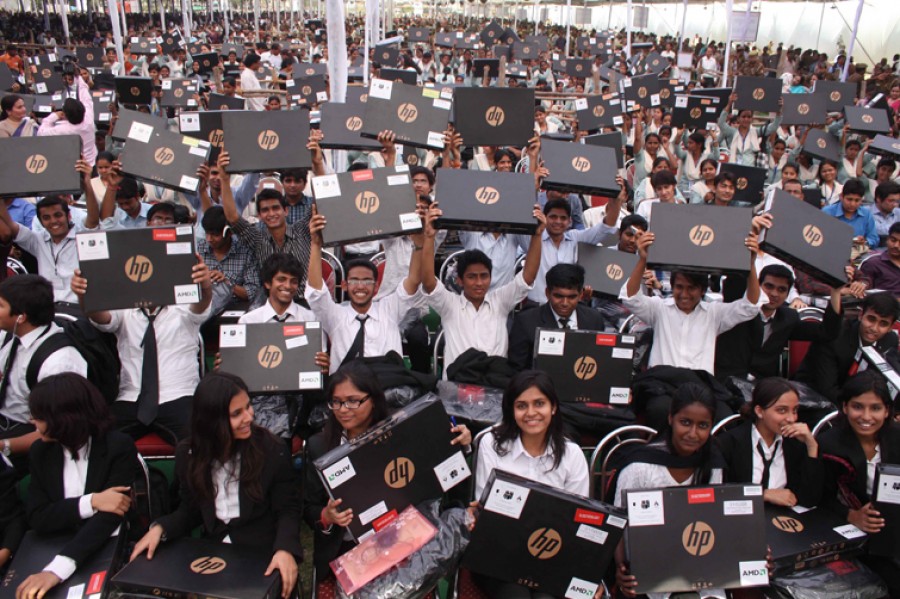 लखनऊ। मुख्यमंत्री अखिलेश यादव ने आरोप-प्रत्यारोप और विवादों के बीच प्रदेश में 12वीं पास छात्र-छात्राओं को निःशुल्क लैपटॉप प्रदान करने की योजना की शुरूआत की। इस मौके पर उन्होंने कहा कि छात्र-छात्राओं को निःशुल्क लैपटॉप उपलब्ध कराकर प्रदेश सरकार इन्हें संसाधन युक्त युवाओं के समकक्ष खड़ा होने का अवसर उपलब्ध करा रही है, मुख्यमंत्री ने कहा कि तेजी से विकसित हो रही दुनिया से जुड़ने के लिए सरकार ने युवाओं को लैपटॉप वितरित करने का निर्णय लिया। लखनऊ में कॉल्विन ताल्लुकेदार कॉलेज के परिसर में आयोजित भव्य कार्यक्रम में लगभग 10 हजार छात्र-छात्राओं को लैपटॉप वितरित किए गए।