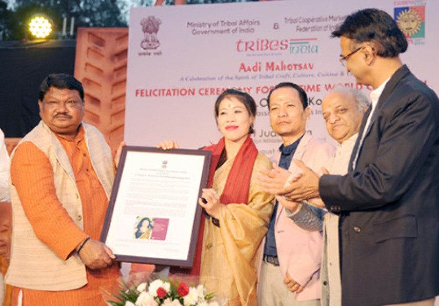 नई दिल्ली। केंद्रीय जनजातीय कार्य मंत्रालय और ट्राइफेड ने दिल्ली हाट में आयोजित आदि महोत्सव के समापन दिवस पर छह बार की महिला विश्व मुक्केबाजी चैंपियन मैरी कॉम का भव्य सम्मान किया। मैरी कॉम ट्राइब्स की ब्रांड एंबेस्डर भी हैं। आदि महोत्सव के दौरान देशभर के जनजातीय दिग्गज शिल्पकारों के विभिन्न उत्पादों को प्रदर्शित किया गया था। इसका आयोजन जनजातीय कार्य मंत्रालय और ट्राइफेड ने 16 से 30 नवंबर तक किया। स्वागत समारोह की अध्यक्षता जनजातीय कार्यमंत्री जुआल ओराम ने की। मैरी कॉम का सम्मान करते हुए जुआल ओराम ने कहा कि मैरी कॉम भारत का गौरव हैं, जिन्होंने अभी हाल में छठवीं महिला विश्व मुक्केबाजी चैंपियनशिप में स्वर्ण पदक जीता है, इस तरह उन्होंने विश्व में किसी भी महिला मुक्केबाज के जीते जानेवाले अधिकतम स्वर्ण पदकों का पुराना तोड़ दिया है। जनजातीय कार्यमंत्री ने कहा कि मैरी कॉम का सम्मान करते हुए जनजातीय कार्य मंत्रालय और ट्राइब्स इंडिया को गर्व हो रहा है, वे ट्राइब्स इंडिया के पंचतंत्र वर्ग के उत्पादों की ब्रांड एंबेस्डर भी हैं, जिन्हें देशभर के जनजातीय दिग्गज शिल्पकार तैयार करते हैं।