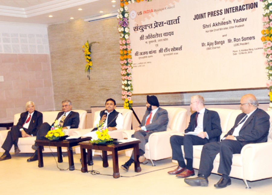 लखनऊ। उत्तर प्रदेश के मुख्यमंत्री अखिलेश यादव ने अपने सरकारी आवास पर यूएस इंडिया बिजनेस काउंसिल यूएसआईबीसी के चेयरमैन अजय बांगा तथा प्रेसिडेंट रॉन सोमर्स के साथ संयुक्त प्रेसवार्ता को संबोधित करते हुए कहा कि प्रदेश सरकार राज्य में निवेश को बढ़ावा देने के उद्देश्य से लगातार कार्य कर रही है, इसके लिए आवश्यक नीतियां भी बना रही है। मुख्यमंत्री ने कहा कि हाल ही में आगरा में इंवेस्टर्स समिट में प्रदेश सरकार ने अपनी नीतियों को उद्योगपतियों के सामने रखा था, जिनसे प्रेरित होकर यह प्रतिनिधिमंडल उत्तर प्रदेश में निवेश के इरादे से यहां आया है। उन्होंने कहा कि सरकार की यह कोशिश होगी कि उत्तर प्रदेश में अधिक से अधिक उद्योग आएं, कारखाने स्थापित हों, ताकि प्रदेश का औद्योगिक वातावरण सुधरे और बेरोज़गारी की समस्या समाप्त हो।