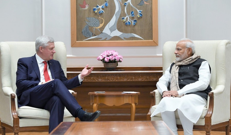 नई दिल्ली। कनाडा के पूर्व प्रधानमंत्री स्टीफन हार्पर ने प्रधानमंत्री नरेंद्र मोदी से नई दिल्ली में मुलाकात की। स्टीफन हार्पर इन दिनों अंतरराष्ट्रीय विषयों पर चर्चा के लिए भारतीय विदेश मंत्रालय के रायसीना डायलॉग कार्यक्रम में शामिल होने के लिए भारत यात्रा पर हैं। दोनों राजनेताओं ने भारत और कनाडा संबंधों के विकास, प्रमुख वैश्विक रूझानों तथा लोकतांत्रिक देशों के बीच सहयोग पर गहन विचार-विमर्श किया।