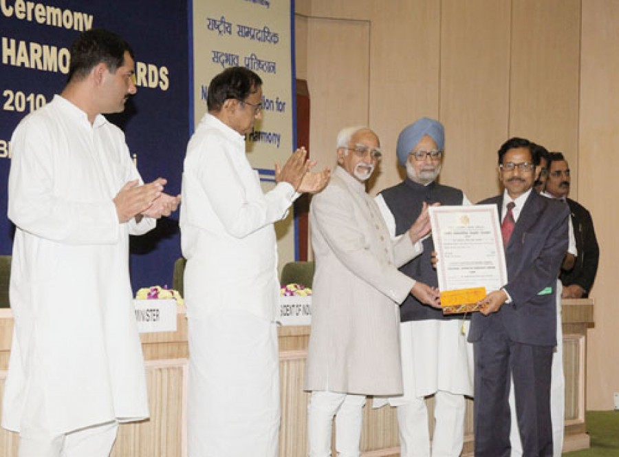 नई दिल्ली। उपराष्ट्रपति मोहम्मद हामिद अंसारी ने एक कार्यक्रम में वर्ष 2009 और 2010 के लिए राष्ट्रीय सांप्रदायिक सद्भाव पुरस्कार प्रदान किए। वर्ष 2009 के लिए व्यक्तिगत संवर्ग में यह पुरस्कार डॉ मोहम्मद हनीफ खान शास्त्री को प्रदान किया गया। डॉ शास्त्री संस्कृत के विद्वान हैं। उन्होंने गीता और कुरान में सामंजस्य, वेद और कुरान से महामंत्र और गायत्री एवं सुरा फातिहा समेत कई पुस्तकें लिखी हैं। डॉ शास्त्री ने अपनी किताबों और विचारों से सांप्रदायिक सद्भाव को बढ़ावा देने के लिए प्रतिबद्धता के साथ काम किया है।