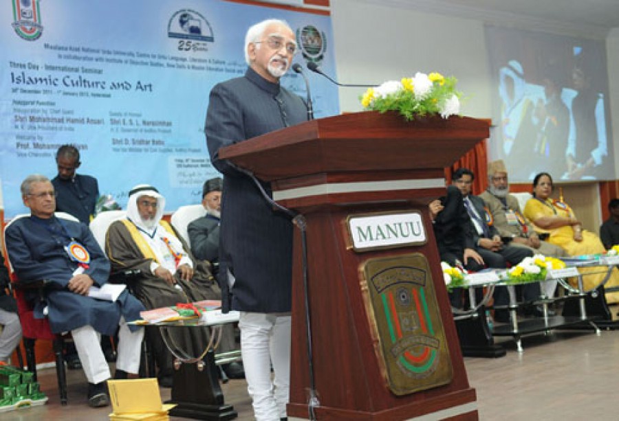 हैदराबाद। उपराष्ट्रपति मोहम्मद हामिद अंसारी ने हैदराबाद के गाछीबावली स्थित मौलाना आजाद राष्ट्रीय उर्दू विश्वविद्यायल में ‘इस्लामिक कला एवं संस्कृति’ विषय पर आयोजित अंतर्राष्ट्रीय संगोष्ठी को संबोधित किया। इस अवसर पर उपराष्ट्रपति ने कहा कि मैं यहां मिश्रित भावों के साथ आया हूं, मैं ऐसे महत्वपूर्ण विश्व पर बोलने के लिए आमंत्रण पाकर गौरवान्वित हूं, विषय की गूढ़ता से डरा भी हूं और अपनी अल्पज्ञता के प्रति गंभीर भी हूं, इसलिए मैं दो दोहों का सहारा लेना चाहूंगा जो सदियों से गंभीर आधार रखते रहे हैं-