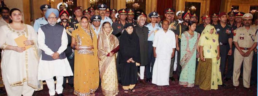नई दिल्ली। राष्ट्रपति और भारतीय सशस्त्र बलों की सुप्रीम कमांडर प्रतिभा देवीसिंह पाटील ने अनुकरणीय बहादुरी, अदम्य साहस और कर्तव्य निष्ठा के प्रति परम समर्पण भावना दिखाने के लिए सशस्त्र बलों के कार्मिकों को राष्ट्रपति भवन में आयोजित एक समारोह में दो कीर्ति चक्र और 16 शौर्य चक्र प्रदान किए। राष्ट्रपति ने सशस्त्र बलों को अतिदुर्लभ श्रेणी की परमविशिष्ट सेवा के लिए वरिष्ठ अधिकारियों को 15 परम विशिष्ट सेवा पदक, तीन बार टु ए विशिष्ट सेवा पदक और 18 अति विशिष्ट सेवा पदक प्रदान किए। पुरस्कार पाने वालों की सूची इस प्रकार है-