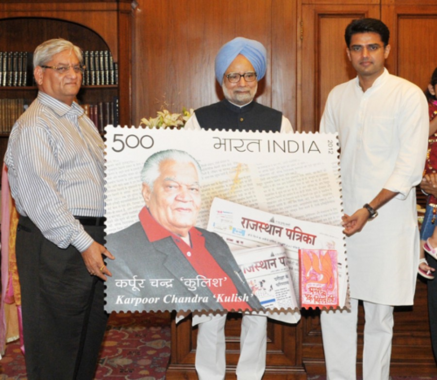 नई दिल्ली। राजस्थान के प्रमुख हिंदी समाचार पत्र राजस्थान पत्रिका के संस्थापक संपादक कर्पूर चंद्र ‘कुलिश’ की स्मृति में डाक विभाग ने पांच रूपए का टिकट जारी किया है, जिसे प्रधानमंत्री मनमोहन सिंह ने जारी किया। इस अवसर पर केंद्रीय संचार राज्य मंत्री सचिन पायलट और राजस्थान पत्रिका समूह के अध्यक्ष गुलाब कोठारी भी उपस्थित थे। प्रधानमंत्री ने पत्रकारिता के क्षेत्र में कर्पूर चंद्र ‘कुलिश’ के योगदान को महान बताया। गुलाब चंद्र कोठारी ने प्रधानमंत्री मनमोहन सिंह और संचार राज्य मंत्री सचिन पायलट का धन्यवाद दिया। राजस्थान पत्रिका समाचार पत्र समूह हिंदी की एक प्रमुख समाचार पत्र श्रृंखला है, जिसने हिंदी पत्रकारिता में अनेक बड़ी प्रतिभाएं विकसित की हैं।
