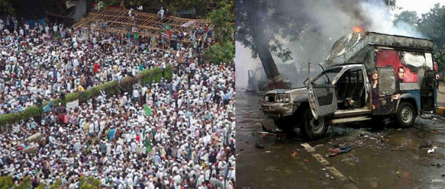 मुंबई। दक्षिण मुंबई के आजाद मैदान में असम दंगों और म्यांमार में हुई हिंसा का विरोध करने के खिलाफ शनिवार को मुस्लिम संगठनों के एक प्रदर्शन में हिंसा भड़क उठी, जिस पर काबू पाने के प्रयास में पुलिस की गोली से एक व्यक्ति की मौत का पता चला है। आगजनी और हिंसा की इस घटना में कई लोग घायल हुए हैं। इनमें एक जवान और मीडियाकर्मी भी हैं। मुंबई पुलिस के मुताबिक कुछ लोगों को हिरासत में लेकर पूछताछ की जा रही है। घटना की जांच मुंबई पुलिस की क्राइम ब्रांच को दे दी गई है। मुंबई पुलिस कमिश्नर अरूप पटनायक ने लोगों से अपील की है कि वे किसी भी तरह की अफवाहों पर न जाएं। मुंबई में रेड अलर्ट घोषित किया गया है।जानकारी के अनुसार यह प्रदर्शन मुस्लिम संगठनों ने आयोजित किया था, जिसमें करीबन ५० हजार प्रदर्शनकारी शामिल हुए थे। शुरू में तो सब कुछ ठीक ठाक रहा, मगर करीब ढाई बजे के बाद भीड़ ज्यादा बढ़ने लगी और प्रदर्शन के दौरान अचानक तोड़-फोड़ शुरू हो गई। बेस्ट बस पर पथराव से इसकी शुरूआत हुई, जिससे माहौल हिंसात्मक होता गया। उग्र भीड़ ने कई गाडि़यों में आग लगाई। इसी भीड़ ने कुछ समय बाद पुलिस की गाड़ियों को निशाना लगाया और उन्हें भी जला दिया।पुलिस को स्थिति पर नियंत्रण पाने के लिए शुरू में लाठी चार्ज करना पड़ा और आसूं गैस के गोले भी छोड़ने पड़े। हिंसक भीड़ ने मीडिया को भी नहीं बख्शा है। कई टीवी चैनल्स की ओबी वेन को भी जलाया गया है। हिंसा की खबर पर पुलिस के वरिष्ठ अधिकारी घटना स्थल पर पहुंचे। पुलिस ने हालात पर काबू पा लेने का दावा किया है और कहा है कि स्थिति सामान्य है। इस हिंसा में अभी तक 30 लोगों के घायल होने की खबर है। सभी घायल जेजे रुग्णालय, सेंट जॉर्ज आणि जीटी अस्पताल में दाखिल कराए गए हैं।इस हिंसा के कारण को लेकर कई बातें कही जा रही हैं, जिनमें एक बात यह भी है कि प्रदर्शन में शामिल कुछ लोग असम दंगों में प्रशासन की भूमिका को पक्षपातपूर्ण बता रहे थे। इनमें से कुछ लोग अचानक हिंसक हो गए और उग्र भीड़ ने तोड़फोड़ शुरू कर दी। पुलिस ने त्वरित कार्रवाई कर हिंसा पर काबू कर लिया। भीड़ ने मैदान से बाहर निकलकर पहले रास्ता रोकने की कोशिश की थी और उसके बाद उसने कई गाड़ियों को आग लगा दी। काबू पाने के लिए मुंबई पुलिस के साथ-साथ केंद्रीय बलों के जवानों को भी बुलाया गया। पुलिस को फायरिंग भी करनी पड़ी, जिसमें एक व्यक्ति की मौत होना बताया गया है।मुंबई पुलिस कमिश्नर अरूप पटनायक ने बताया कि शाम को करीब तीन बजे तक हालात बिल्कुल सामान्य थे। सवा तीन बजे के आसपास कुछ ने हिंसा की जिसके बाद हालात बिगड़ गए। शाम करीब साढ़े पांच बजे प्रदर्शकारियों के लौटते वक्त फिर से कुछ हुड़दंग हुआ जिसमें फायरिंग में एक व्यक्ति की मौत हो गई और एक जवान गंभीर रूप से घ