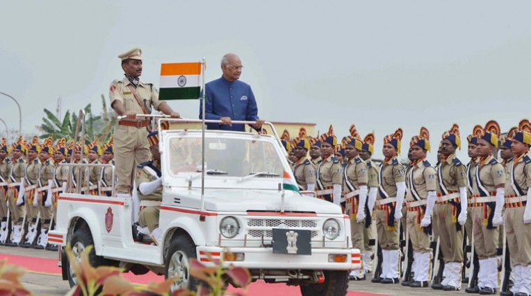 भुवनेश्वर। राष्ट्रपति रामनाथ कोविद ने 17 मार्च 2018 को भुवनेश्वर में सलामी गारद का निरीक्षण किया।