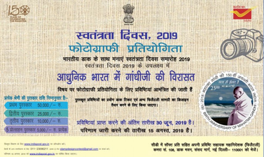 लखनऊ। लखनऊ मुख्यालय परिक्षेत्र के निदेशक डाक सेवाएं कृष्ण कुमार यादव ने बताया है कि स्वतंत्रता दिवस-2019 के उपलक्ष्य में भारतीय डाक विभाग 'आधुनिक भारत में गांधीजी की विरासत' विषय पर एक फोटोग्राफी प्रतियोगिता का आयोजन कर रहा है, जिसमें देश के सभी भागों से किसी भी आयु वर्ग के प्रतिभागी भाग ले सकते हैं। फोटोग्राफी प्रतियोगिता के लिए आवेदन की अंतिम तिथि 30 जून 2019 है। फोटोग्राफी प्रतियोगिता के संबंध में जानकारी देते हुए उन्होंने कहा कि यदि आप फोटोग्राफी का शौक रखते हैं तो आप द्वारा लिया गया मौलिक फोटोग्राफ भी स्वतंत्रता दिवस पर जारी होने वाले डाक टिकट पर स्थान पा सकता है, विजेता प्रविष्टियों का प्रयोग स्वतंत्रता दिवस पर जारी स्मारक डाक टिकटों के डिजाइन एवं अन्य फिलेटलिक वस्तुओं के प्रयोग में किया जाएगा।