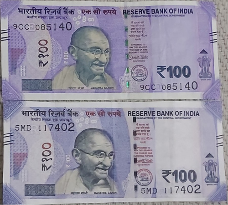 लखनऊ। सावधान! जामुनी रंग का सौ रुपये का नकली नोट भी बाज़ार में उतार दिया गया है। ये जो नोट आप देख रहे हैं इनमें ऊपर वाला सौ रुपये का नोट असली है, जबकि उसके नीचे का जो सौ रुपये का नोट है, वह नकली है। ऊपर वाले सौ रुपये के असली होने की पहचान यह है कि उसके अंदर चौड़ी पट्टी लाइन चमकीली है, जबकि नीचे के नोट में केवल एक पट्टी तो है, मगर वह चमकीली नहीं है। दूसरी पहचान यह है कि ऊपर के असली नोट में गोल आकार में आरबीआई का शेर वाला लोगो इस पट्टी से कुछ दूरी पर है, जबकि नीचे नकली नोट में वह इस पट्टी से सटा हुआ है। एक और पहचान यह है कि असली नोट में नोट का नंबर स्मॉल लेटर में है, जबकि नकली नोट में नोट का नंबर कैपिटल लेटर में है। नकली नोट के बारे में पुलिस को अवश्य सूचित करें।