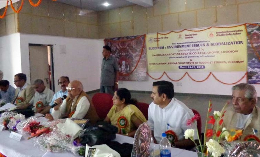 लखनऊ। कालीचरण पीजी कालेज लखनऊ एवं अंतर्राष्ट्रीय बौद्ध शोध संस्थान के संयुक्त तत्वावधान में बौद्ध धर्म पर्यावरण एवं भूमंडलीकरण विषय पर दो दिवसीय राष्ट्रीय संगोष्ठी का राजर्षि पुरषोत्तम दास टंडन सभागार में आयोजन किया गया। लखनऊ के सांसद लालजी टंडन ने इसमें मुख्य अतिथि के रूप में भाग लिया। गौतम बुद्ध विश्वविद्यालय के संकायाध्यक्ष डॉ आनंद सिंह, अंतराष्ट्रीय बौद्ध शोध संस्थान के निदेशक डॉ योगेंद्र सिंह, विधान परिषद सदस्य डॉ महेंद्र सिंह, महात्मा गांधी काशी विद्यापीठ के प्रोफेसर परमानंद सिंह, लखनऊ विश्वविद्यालय के प्राचीन भारतीय इतिहास के पूर्व विभागाध्यक्ष प्रोफेसर अमर सिंह एवं बंग्लादेश से आई वेन भिक्खु पाल ने माँ सरस्वती एवं महात्मा बुद्ध की प्रतिमाओं पर पुष्पांजलि अर्पित कर दीप प्रज्जवलन किया।