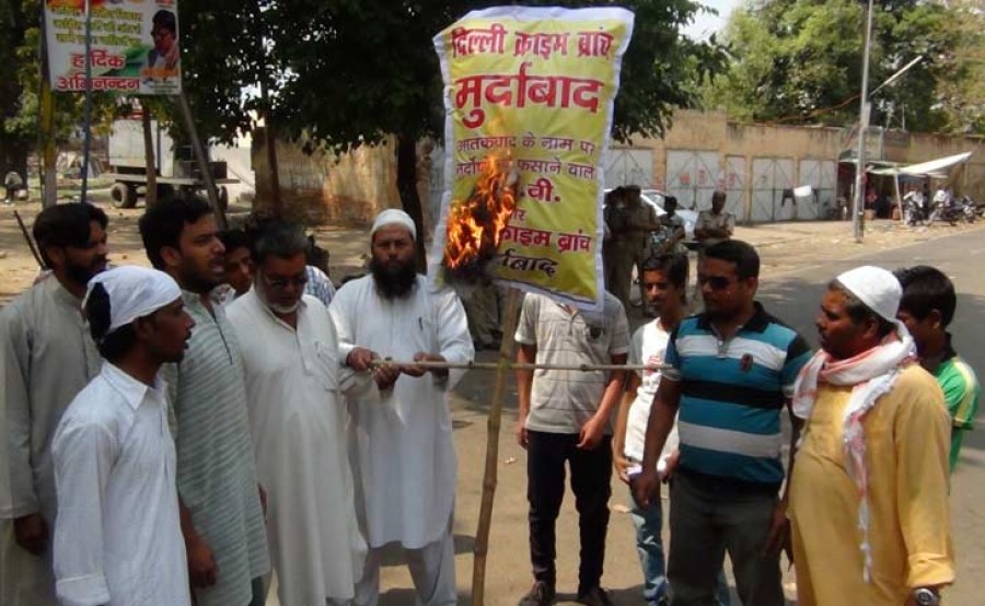 लखनऊ। लियाकत शाह की कथित फर्जी गिरफ्तारी और होली के दौरान आतंकवाद के नाम पर देश में असुरक्षा का माहौल बनाने व हिंदुओं और मुसलमानों के बीच कटुता बढ़ाने के आरोप के साथ दिल्ली क्राइम ब्रांच और आईबी का रिहाई मंच ने लखनऊ में विधानसभा के सामने पुतला फूंका। इस दौरान मौजूद एलआईयू के इंसपेक्टर केके सिंह ने मीडिया फोटोग्राफरों को आईबी और दिल्ली क्राईम ब्रांच के पुतला दहन की तस्वीर खींचने से मना किया और कहा कि आईबी और क्राइम ब्रांच का पुतला फूंकना संविधान के खिलाफ है, जिसे मीडिया नहीं छाप सकती। रिहाई मंच ने उत्तर प्रदेश सरकार से एलआईयू के इस्पेक्टर केके सिंह को भी तत्काल निलंबित करने की मांग करते हुए कहा कि वह भी मीडिया को मैनेज कर पुलिस और आईबी के खिलाफ खबरों को दबाती है और मुसलमानों के खिलाफ भ्रामक खबरों को प्रसारित करवाती है।