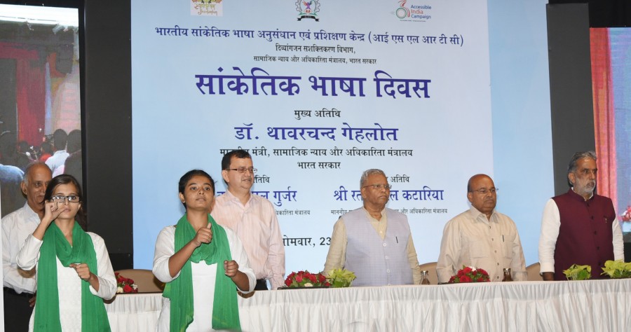 नई दिल्ली। केंद्रीय सामाजिक न्याय एवं अधिकारिता मंत्रालय के दिव्यांगजन सशक्तिकरण विभाग के अंतर्गत स्वायत्त संस्था भारतीय सांकेतिक भाषा अनुसंधान एवं प्रशिक्षण केंद्र ने आज सांकेतिक भाषा दिवस मनाया। कार्यक्रम में केंद्रीय सामाजिक न्याय एवं अधिकारिता मंत्री थावरचंद गहलोत, राज्यमंत्री कृष्णपाल गुर्जर और रतनलाल कटारिया मुख्य अतिथि के रूपमें शामिल हुए। थावरचंद गहलोत ने कहा कि भारत सरकार समस्त दिव्यांगों को मुख्यधारा में लाने के लिए संकल्पबद्ध है। उन्होंने सांकेतिक भाषा के 6 हजार शब्दों का शब्दकोश निकालने के लिए आईएसएलआरटीसी की सराहना की और आशा व्यक्त की कि 2020 तक 4 हजार अन्य नए सांकेतिक शब्द इस शब्दकोश में जोड़े जाएंगे। उन्होंने कहा कि सांकेतिक भाषाओं का प्राचीन इतिहास है और आजकल इन्हें आधुनिक तरीके से विकसित किया जा रहा है, इन सांकेतिक भाषाओं में राष्ट्रीय और अंतर्राष्ट्रीय स्तर पर एकरूपता लाने के लिए भी प्रयास किए जा रहे हैं। उन्होंने कहा कि दिव्यांगों के कल्याण के लिए उनके मंत्रालय ने बहुत सी पहलें शुरु की हुई हैं।