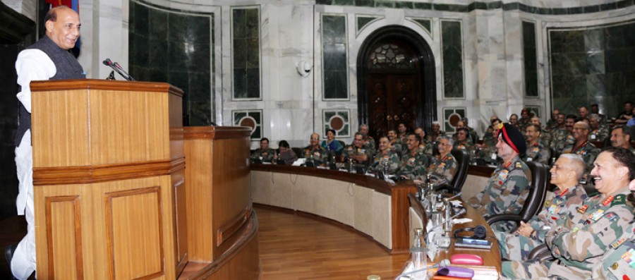 नई दिल्ली। रक्षामंत्री राजनाथ सिंह ने सेना कमांडर सम्मेलन में कमांडरों और अधिकारियों को संबोधित किया और अपने कार्यकाल के दौरान अपने तरह के इस पहले कार्यक्रम में सेना के सभी वरिष्ठ अधिकारियों से मिलने पर खुशी जताई। रक्षामंत्री ने सशस्त्र बलों से संबंधित अपने छात्र और राजनीतिक जीवन के व्यक्तिगत अनुभवों और भावनाओं को भी साझा किया। रक्षामंत्री ने सेना को देश के सामने आने वाली सभी चुनौतियों विद्रोह, सीमा अथवा एचएडीआर ड्यूटी से निपटने वाला अंतिम उपाय करार दिया। उन्होंने सेना के विभिन्न पदों एवं भूमिका में विश्वास जताया और संतोष व्यक्त किया। उन्होंने जम्मू-कश्मीर में आतंकवाद एवं हिंसक हमलों जैसी चुनौतियों से निपटने में सभी सुरक्षा एजेंसियों के साथ समन्वय में सेना की भूमिका की सराहना की और इसे अनुकरणीय बताया।