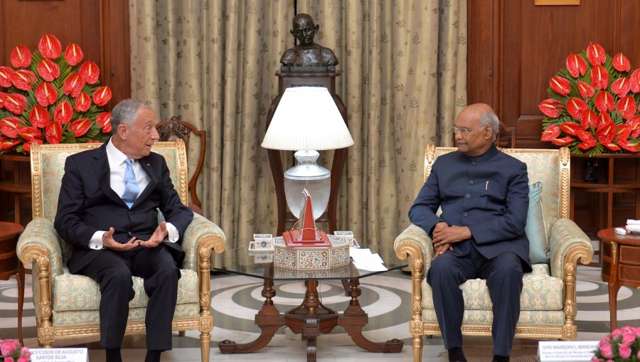 नई दिल्ली। राष्ट्रपति रामनाथ कोविंद ने राष्ट्रपति भवन में पुर्तगाल के राष्ट्रपति मार्सेलो रेबेलो डी सोसा का जोरदार स्वागत किया। पुर्तगाल के राष्ट्रपति पहलीबार भारत की राजकीय यात्रा पर आए हैं। राष्ट्रपति रामनाथ कोविंद ने इस अवसर पर कहा कि पुर्तगाल और भारत के बीच विशेष संबंध हैं, दोनों देशों का 500 वर्ष पुराना साझा इतिहास है, दोनों देश गोवा और मुंबई के माध्यम से, अपनी संस्कृति, भाषा और रिश्तेदारी के माध्यम से निकटतापूर्वक जुड़े हुए हैं। राष्ट्रपति ने कहा कि हम महात्मा गांधी की जयंती समारोह की बैठक के लिए कुछ महीने पहले पुर्तगाल के प्रधानमंत्री एंटोनियो कोस्टा का स्वागत करके बहुत खुश हुए थे। रामनाथ कोविंद ने महात्मा गांधी की 150वीं जयंती के उपलक्ष्य में अपना समर्थन देने के लिए पुर्तगाल को धन्यवाद दिया।