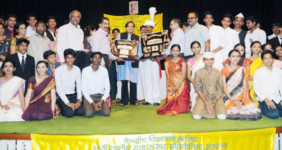 नई दिल्ली। केंद्रीय विद्यालयों की 25 वीं राष्ट्रीय युवा संसद प्रतिस्पर्धा के लिए पुरस्कार वितरण समारोह का आयोजन सोमवार को संसद के पुस्तकालय भवन के जीएमसी बालयोगी सभागार में किया गया। मानव संसाधन विकास राज्यमंत्री डॉ शशि थरूर ने कार्यक्रम की अध्यक्षता की एवं वर्ष 2012-13 के शैक्षणिक सत्र में आयोजित हुई प्रतिस्पर्धा के विजेता छात्रों/विद्यालयों को उनके शानदार प्रदर्शन के लिए पुरस्कार वितरित किये। इस अवसर पर प्रतिस्पर्धा में प्रथम स्थान पाने वाले केंद्रीय विद्यालय पंगोडे, त्रिवेंद्रम ने ’युवा संसद’ की एक छोटी प्रस्तुति भी दी। सन् 1966 में एक साधारण सी शुरूआत, जिसका पहला आयोजन संसदीय मामलों के मंत्रालय ने दिल्ली प्रशासन के 16 विद्यालयों में किया था से, शुरू हुई युवा संसद योजना के अंतर्गत अब राष्ट्रीय राजधानी दिल्ली के 1200, केंद्रीय विद्यालय के 1200, जवाहर नवोदय विद्यालय के 600 और देश भर से विभिन्न 300 विश्वविद्यालयों, महाविद्यालयों से प्रतिभागी आते हैं।