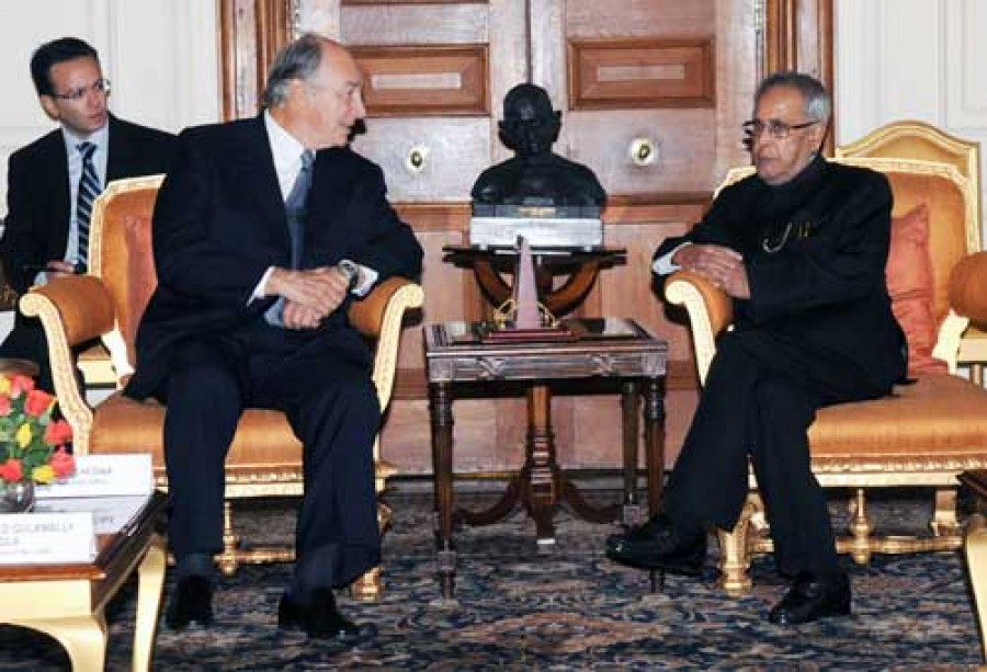 नई दिल्ली। जाने-माने समाजसेवी आगा खान ने आज राष्ट्रपति भवन में राष्ट्रपति प्रणब मुखर्जी से मुलाकात की। मुलाकात के दौरान राष्ट्रपति ने कहा कि भारत, आगा खान और दुनिया के अनेक क्षेत्रों में जरूरतमंद और सुविधाओं से वंचित लोगों को सेवा प्रदान करने के उनके उत्कृष्ट अभियान की बेहद प्रशंसा करता है। आगा खान ने मानवता की सेवा और सहनशीलता जैसे विषयों पर जोर देते हुए सांप्रदायिकता और रूढ़िवाद को समाप्त करने में अपना महत्वपूर्ण योगदान दिया है।