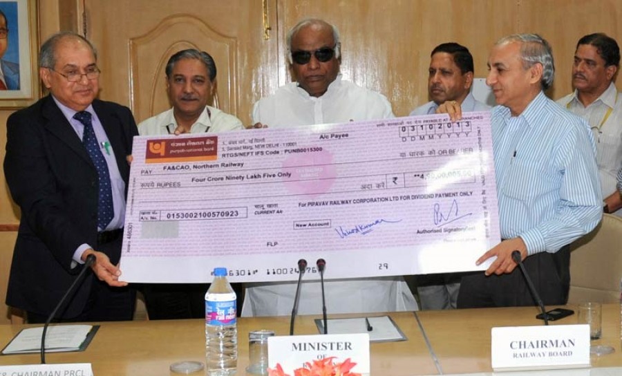 नई दिल्ली। पीपावाव रेलवे कॉरपोरेशन ने रेल मंत्री मल्लिकार्जुन खडगे को 4.90 करोड़ रूपये के पहले अंतरिम लाभांश का चैक दिया है। कॉरपोरेशन के अध्यक्ष और रेलवे बोर्ड के सदस्य यातायात डीपी पांडे और कॉरपोरेशन के प्रबंध निदेशक पंकज मालवीय ने आज नई दिल्ली में एक समारोह में खड़गे को वित्त वर्ष 2013-14 के लिए अंतरिम लाभांश का यह चैक सौंपा। इस अवसर पर मल्लिकार्जुन खड़गे ने कहा कि यह बहुत ही उत्साहजनक बात है कि यह संयुक्त उद्यम लाभांश कमाने की स्थिति में आ गया है। यह कंपनी सरकार-निजी क्षेत्र भागीदारी के प्रयास की सफलता का प्रतीक है। अवसंरचना विकास से संबंधित ऐसी परियोजनाओं के लिए सरकार-निजी क्षेत्र की भागीदारी की आवश्यकता है। रेलवे बोर्ड के अध्यक्ष अरूणेंद्र कुमार ने भी कॉरपोरेशन की सफलता की सराहना की।