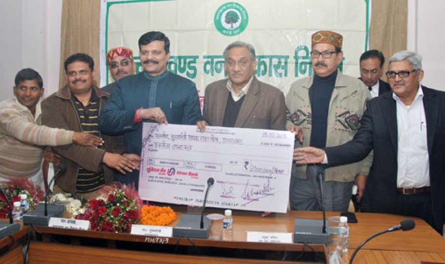 देहरादून। वन विकास निगम उत्तराखंड ने मुख्यमंत्री राहत कोष के लिए मुख्यमंत्री विजय बहुगुणा को 21 लाख रूपए धनराशि का चैक भेंट किया। निगम के कार्यालय में आयोजित एक सादे समारोह में अध्यक्ष कुंवर प्रणव सिंह चैंपियन ने मुख्यमंत्री विजय बहुगुणा को चैक सौंपा। इस पर मुख्यमंत्री ने वन विकास निगम का आभार प्रकट करते हुए कहा कि उत्तराखंड के विकास में वन विभाग व वन विकास निगम की अहम भूमिका है, वन राष्ट्रीय धरोहर हैं, इन्हें बचाए रखना हमारा दायित्व है, वनों के संरक्षण के साथ ही स्थानीय लोगों के हितों को भी सुनिश्चित किया जाना चाहिए। उन्होंने वन पंचायतों को सशक्त किए जाने की आवश्यकता पर भी बल दिया।
