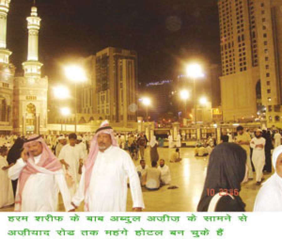 मक्का मोअज्जिमा में हरम के इर्द-गिर्द की जो इमारतें और बाजार तोड़े गए, उनमें हरम के बाब अब्दुल अजीज के सामने से अजीयाद रोड पर बने अस्पताल तक मंहगे आलीशान होटल बन चुके है। दाहिनी तरफ हिल्टन होटल की सात इमारतें और एक इंटर कांटीनेंटल होटल खड़ा है। मरवा की पहाडि़यों की तरफ जो बहुत बड़े बाजार थे और लाखों हाजियों के ठहराने की जो इमारते बनी थी वह सब टूट चुकी हैं। बाब उस्सलाम खत्म किया जा चुका है। एक भी चाय खाना, सस्ते खाने के होटल और नाई की दुकानें नहीं बची है। अब अगर कोई हाजी एक कप चाय भी पीना चाहेगा तो उसे एक या दो रियाल की चाय न मिलकर कम से कम दस और ज्यादा से ज्यादा बीस रियाल की चाय मिलेगी, क्योंकि फाइव स्टार होटलों के रेट यही हैं। इन होटलों में खाना खाने का तो आम हाजी तसव्वुर भी नहीं कर सकता। क्योंकि उनमें सिर्फ सुबह के नाश्ते के लिए साठ से सौ रियाल तक वसूले जाते हैं। इस सिलसिले में जब हमने कुछ मकामी शाही अफसरान से बात करने की कोशिश की तो कोई बात करने को तैयार नहीं हुआ। अल्लाह के घर के बंदोबस्त में लगे एक छोटे अफसर ने सिर्फ इतना कहा कि जबल-ए-उमर को तोड़ने का काम चल रहा है, वहां पर बड़ी तादाद में सस्ते होटल बनेंगे। जवल-ए-उमर तोड़ने का काम कब मुकम्मल होगा इस पर उनका जवाब था, तीन साल। फिर इमारते कब तक बन पाएंगी, इस सवाल का उन्होने हाथ के इशारे से जवाब दिया और कहा कि पता नहीं।