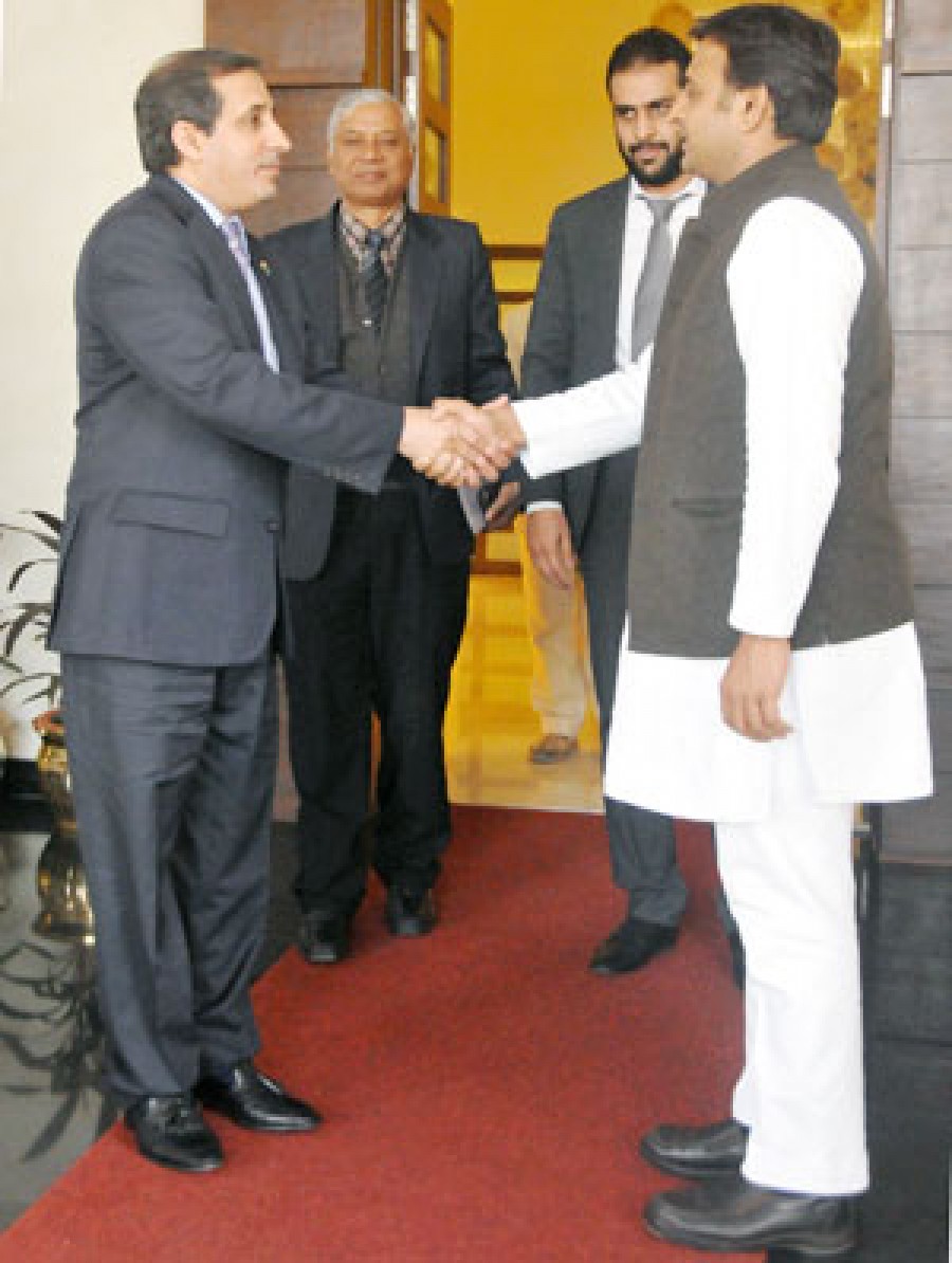 लखनऊ।उत्तर प्रदेश के मुख्यमंत्री अखिलेश यादव से गुरूवार को सऊदी अरब के राजदूत डॉ सऊद मोहम्मद अल सती ने उनके सरकारी आवास 5, कालिदास मार्ग, लखनऊ पर शिष्टाचार भेंट की। इस अवसर पर सऊदी दूतावास के अन्य अधिकारी भी उपस्थित थे। दोनो नेताओं के बीच काफी देर तक विचारों का आदान प्रदान हुआ। इस मौके पर मुख्यमंत्री के प्रमुख सचिव राकेश गर्ग भी मौजूद थे।