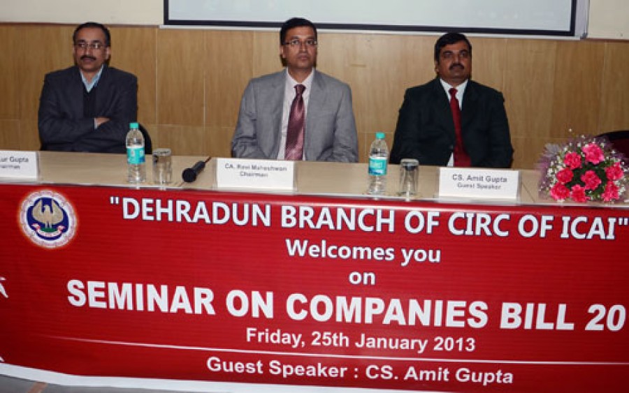 देहरादून। इंस्टीटयूट ऑफ चार्टड एकाउंटेंट ऑफ इंडिया (आईसीएआई) की सुभाष रोड शाखा में कंपनी बिल 2012 एक दिवसीय सेमिनार का आयोजन किया गया। सेमिनार का उदघाटन लखनऊ के कंपनी सेक्रेटरी अमित गुप्ता व देहरादून शाखा के अध्यक्ष सीए रवि माहेश्वरी ने किया। मुख्य वक्ता अमित गुप्ता ने कार्यक्रम में उपस्थित सीए एवं छात्रों को कंपनी बिल 2012 के सभी अधिनियम, नियमों एवं कानूनों की विस्तृत जानकारी दी और नये कंपनी बिल को एक अच्छा बिल बताया।