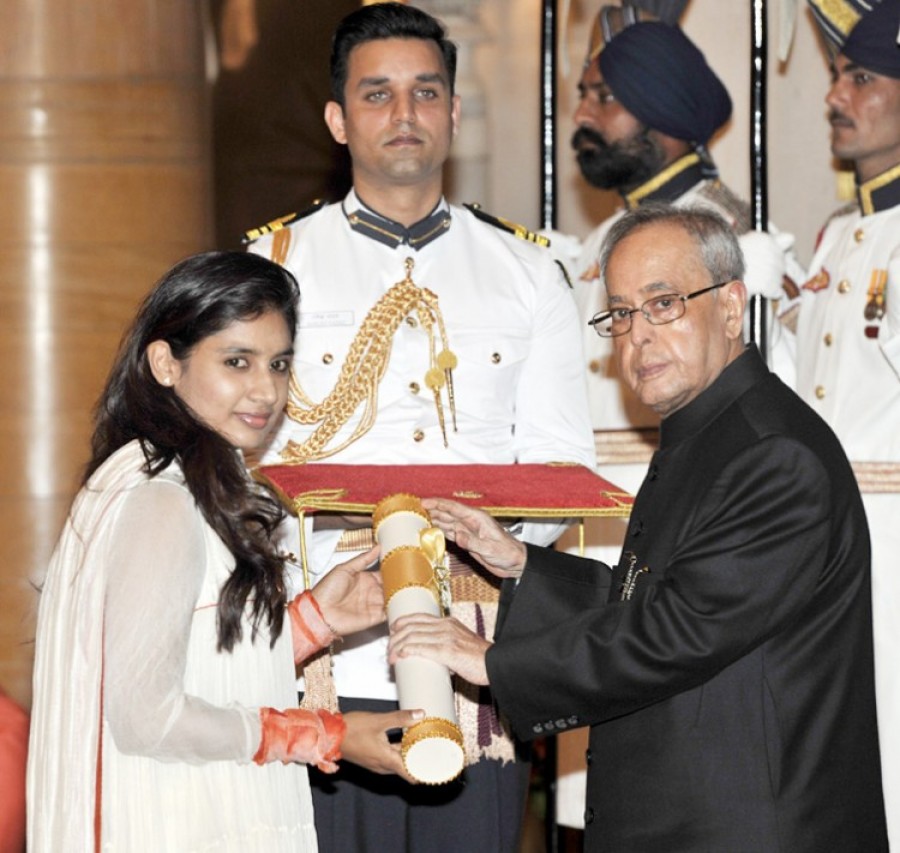 नई दिल्ली। भारतीय रेल की खिलाड़ी और भारतीय रेल क्रिकेट टीम की कप्तान मिताली राज को राष्ट्रपति प्रणब मुखर्जी ने राष्ट्रपति भवन में आयोजित एक समारोह में पद्मश्री से सम्मानित किया। मिताली राज वर्ष 2001 में भारतीय रेल में शामिल हुईं और वह न केवल रेलवे महिला क्रिकेट टीम की कप्तान रहीं, बल्कि भारतीय महिला क्रिकेट टीम की भी कप्तान रहीं। फिलहाल वह दक्षिण मध्य रेल में मुख्य कार्यालय अधीक्षक के रूप में कार्यरत हैं। मिताली राज इस समय 703 रेटिंग अंकों के साथ बैटिंग टेबल में शीर्ष पर हैं और महिलाओं के बीच ओडीआई चार्ट में पहले नंबर की क्रिकेटर के रूप में चिन्हित हैं। मिताली राज को वर्ष 2003 में अर्जुन पुरस्कार प्राप्त करने का गौरव भी मिला है।