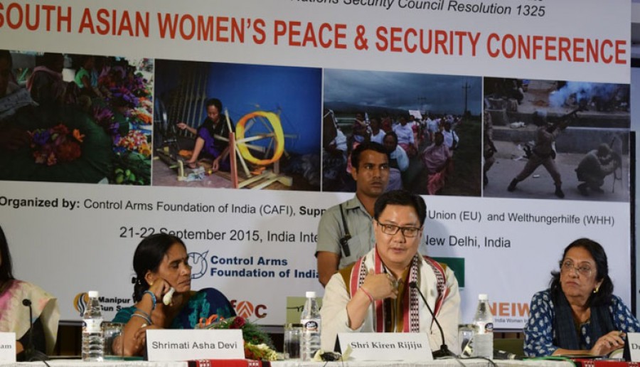 किरेन रिजिजू ने कहा कि भारत, महिलाओं की समानता पर आधारित विभिन्न क्षेत्रीय और वैश्विक संधियों का हस्ताक्षरकर्ता है, उन्होंने कहा कि महिलाओं की सुरक्षा और समानता के मुद्दे पर भारत के पास जिस प्रकार के अस्पष्ट और सशक्त वैधानिक प्रावधान हैं, उतना अन्य किसी देश के पास नहीं हैं। उन्होंने कहा कि भारत में महिलाओं की सुरक्षा के लिए कई वैधानिक प्रावधान तो हैं, किंतु समाज की सोच में यह समस्या ग्रसित है। उन्होंने कहा कि हमें एक साथ आकर सामूहिक तौर पर इस समस्या का समाधान ढूंढना है। उन्होंने कहा कि इन मुद्दों पर एकजुटता दर्शाने के लिए मैं यहां आया हूं, कृपया मुझे अपने आंदोलन का हिस्सा मानें, इन देशों में महिलाओं के लिए शांति और सुरक्षा सुनिश्चित करने के लिए हमें साथ मिलकर काम करना चाहिए।