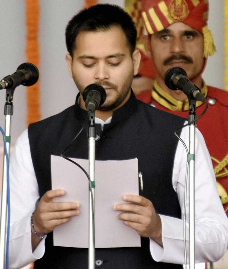 लालू प्रसाद यादव के बड़े बेटे तेज प्रताप यादव शुक्रवार को जब पटना के गांधी मैदान में मंत्री पद की शपथ लेने में अपेक्षित की जगह जब उपेक्षित बोल गए तो राज्यपाल रामनाथ कोविद ने उन्हें फिर से पद और गोपनीयता की शपथ दिलाई। लालू यादव के बड़े बेटे तेज प्रताप के बारे में कहा जाता है कि वह राजनीति में अपने छोटे भाई तेजस्वी यादव जैसे तेज़तर्रार नहीं माने जाते हैं। चुनाव के दौरान दोनों भाइयों में कौन बड़ा है, इसे लेकर भी विवाद रहा। तेज प्रताप के नामांकन पत्र में उनकी उम्र 25 और तेजस्वी की उम्र 26 साल बताई गई थी। तेजस्वी यादव राघोपुर विधानसभा क्षेत्र से जीतकर आए हैं। राजनीति में छोटे-बडे़ का धर्म कितना निभेगा, यह भी समय ही बताएगा, फिलहाल चर्चा इसी बात की ज्यादा है कि लालू यादव के किसी एक बेटे की लालू यादव के प्रतिनिधि के रूप में ताजपोशी समझ में आती है, लेकिन मुख्यमंत्री के बाद तेजस्वी का नाम आना इस बात का संकेत है कि बिहार की कुर्सी की दिशा क्या होगी।