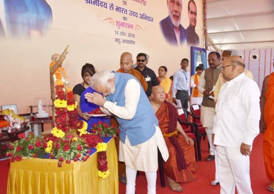 प्रधानमंत्री नरेंद्र मोदी ने भारतीय संविधान के निर्माता बाबासाहेब अंबेडकर की 125वीं जयंती पर उनकी जन्मस्थली महू गए और उन्हें भावपूर्ण पुष्पांजलि अर्पित की। उन्होंने कहा कि मैं डॉ अंबेडकर की वजह से प्रधानमंत्री बना हूं और उनके बनाए संविधान के फलस्वरूप मुझे ग़रीबों की सेवा का मौका मिला है। उन्होंने महू में एक सार्वजनिक सभा में ‘ग्राम उदय से भारत उदय अभियान’ का शुभारंभ करते हुए कहा कि यह उनका सौभाग्य है कि वह इस शुभ दिवस पर महू में हैं। उन्होंने कहा कि डॉ अंबेडकर ने समाज में अन्याय के खिलाफ और समानता एवं सम्मान के लिए लड़ाई लड़ी थी। प्रधानमंत्री ने कहा कि 24 अप्रैल 2016 तक चलने वाले ग्राम उदय से भारत उदय अभियान में गांवों में होने वाले विकास कार्यों पर ध्यान केंद्रित किया जाएगा। उन्होंने कहा कि इस साल का केंद्रीय बजट किसानों और गांवों को समर्पित है, विकास की पहलों को ग्रामीण विकास पर केंद्रित होना चाहिए।